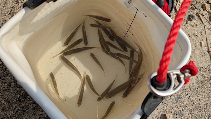 雑草が邪魔でやりづらいが、しばらく続けていると魚が寄ってきて入れ食い状態に。ほぼタモロコだけど、レア枠でカワムツとクチボソの姿も。