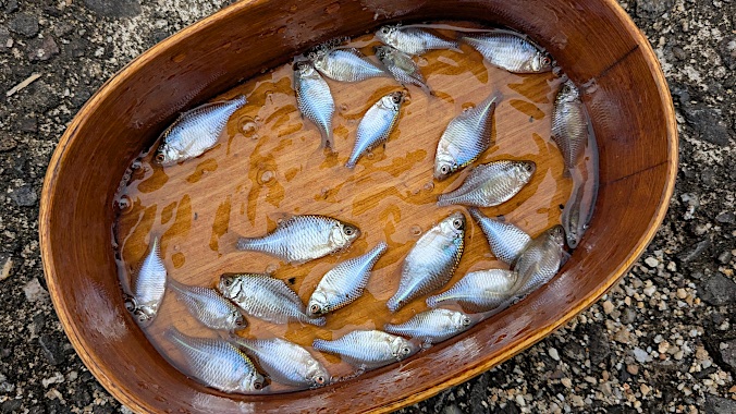 側溝の水位が低下し、川とつながる経路が分断、唯一水の残る場所に取り残されたタイリクバラタナゴを救出する釣りに。