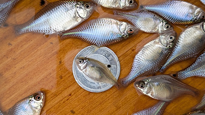 表層から中層を漂うカダヤシが鬱陶しいが、タイバラも問題なく釣れます。当歳魚も混じり、1円(2cm)サイズは無理だが2.5cmくらいの個体なら新紅鱗タナゴの針で掛かります。