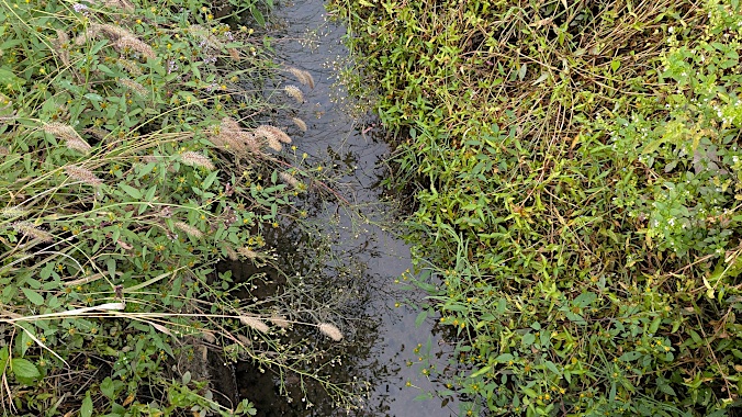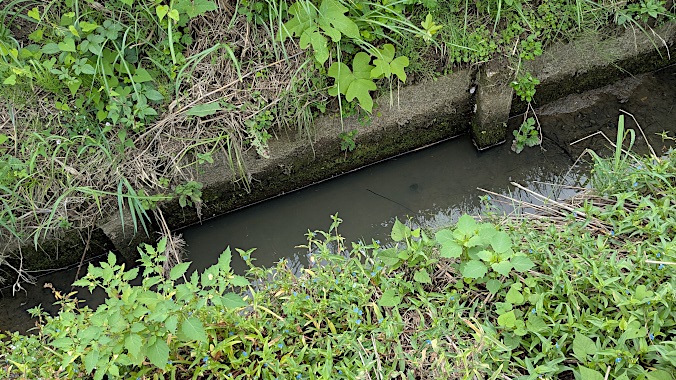 二か所目の実績地の側溝(ドブ)へ移動。ポイントを確認したところ、水位低下で川と完全に分断され、唯一水が残った限られた場所にカダヤシとタイバラっぽい魚影が確認できたことから、自宅に戻りタックル一式をもって10:40頃から開始。