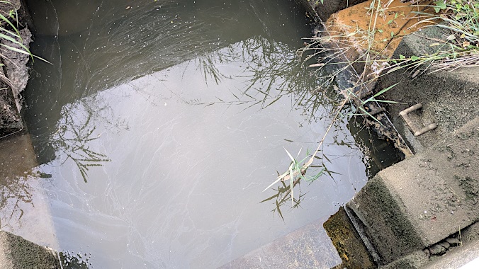 一か所目の側溝(ドブ)は激浅で底に藍藻がべったり付着しており、ハゼ類以外の魚影は確認できず。このドブと川がつながるマスを覗き込むと、ヘチ際や底に大量に魚影(恐らく鯉っ子か小鮒の当歳魚メイン)が確認できるが、超絶に水が汚い。水カビ病や松かさ病っぽい個体もぱっと見で10匹程度は確認できる状況で、さすがにここで釣りをするのは躊躇する状況。