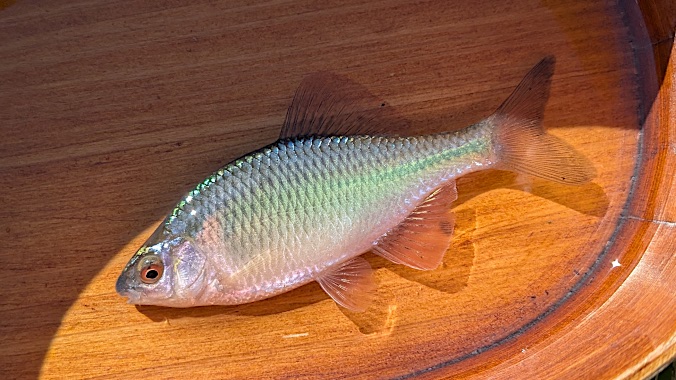 例外なく食いが浅く、数は釣れないもののヤリタナゴを確保。目視確認できるカネヒラは相変わらずの難易度で、仕掛けを落とすと逃げて行ってしまう状況だったが、最終的に一匹引っかけて満足したため終了。(ヤリタナゴ16匹、アブラボテ2匹、カネヒラ1匹)